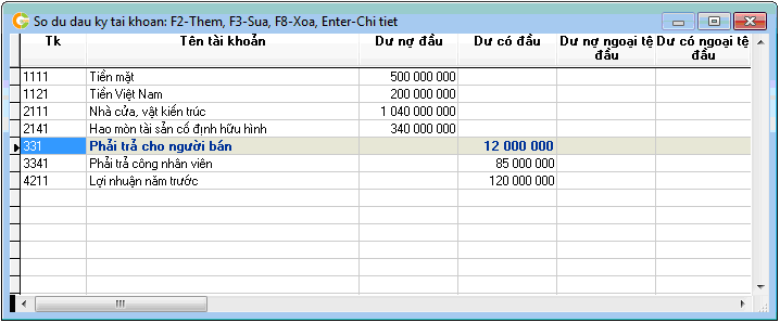 Từ màn hình danh sách chúng ta có thể thêm, sửa, xóa số dư đầu kỳ tài khoản. Bạn hãy để ý trên thanh tiêu đề của cửa sổ này sẽ thấy những hướng dẫn về cách sử dụng phím chức năng như: